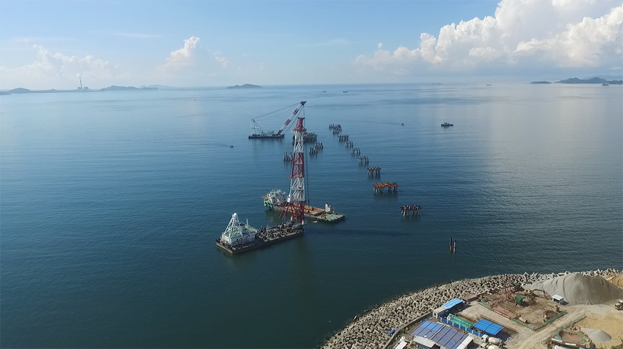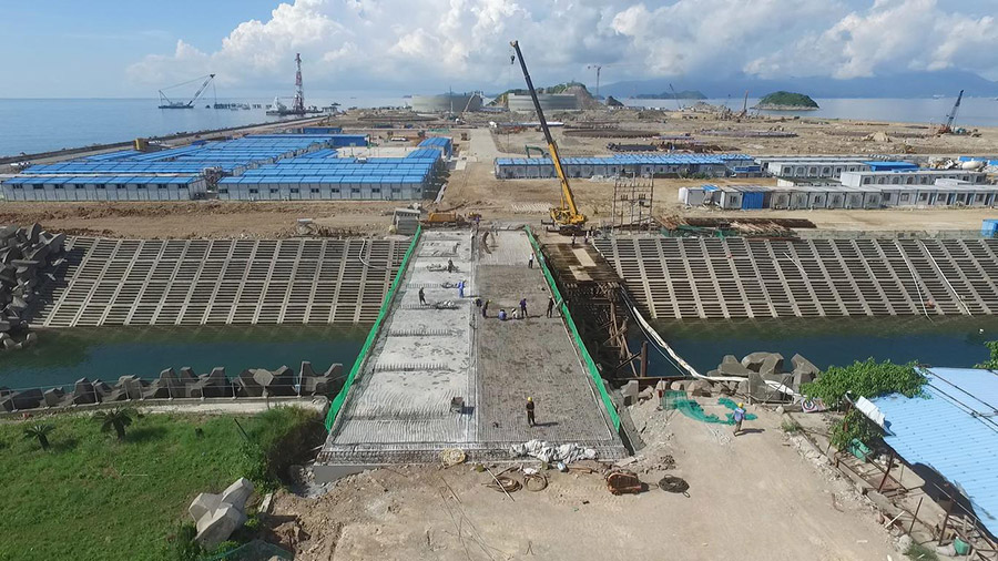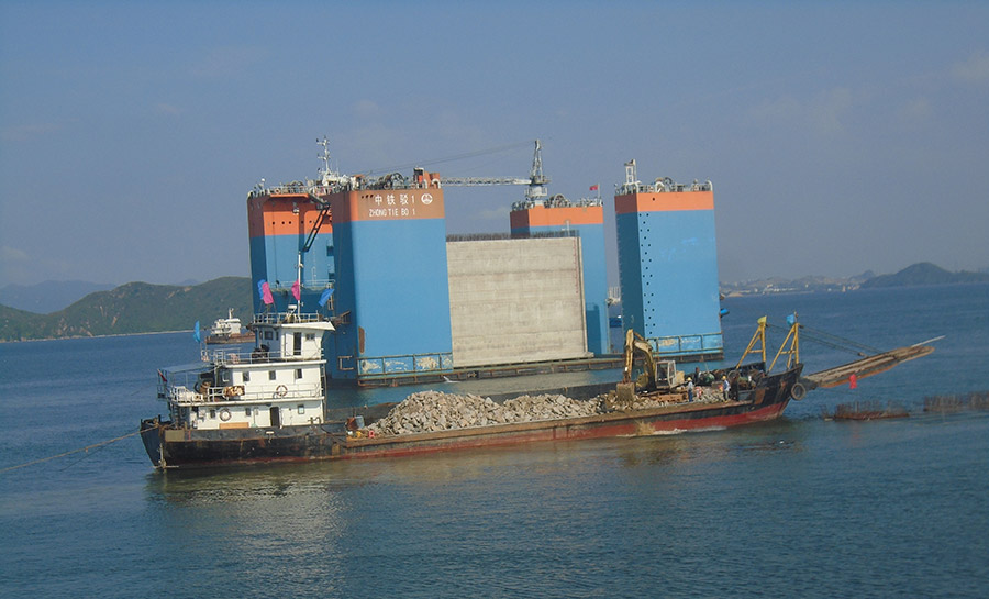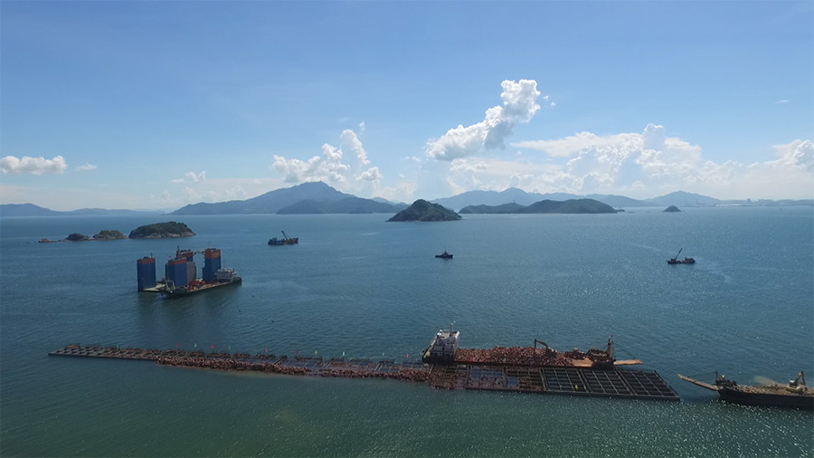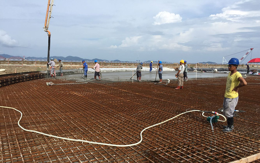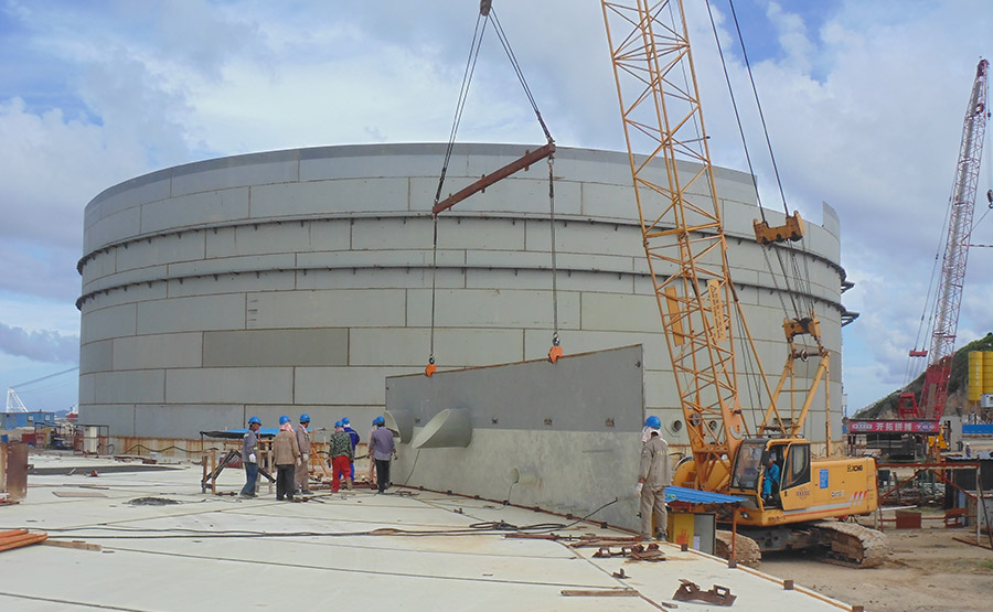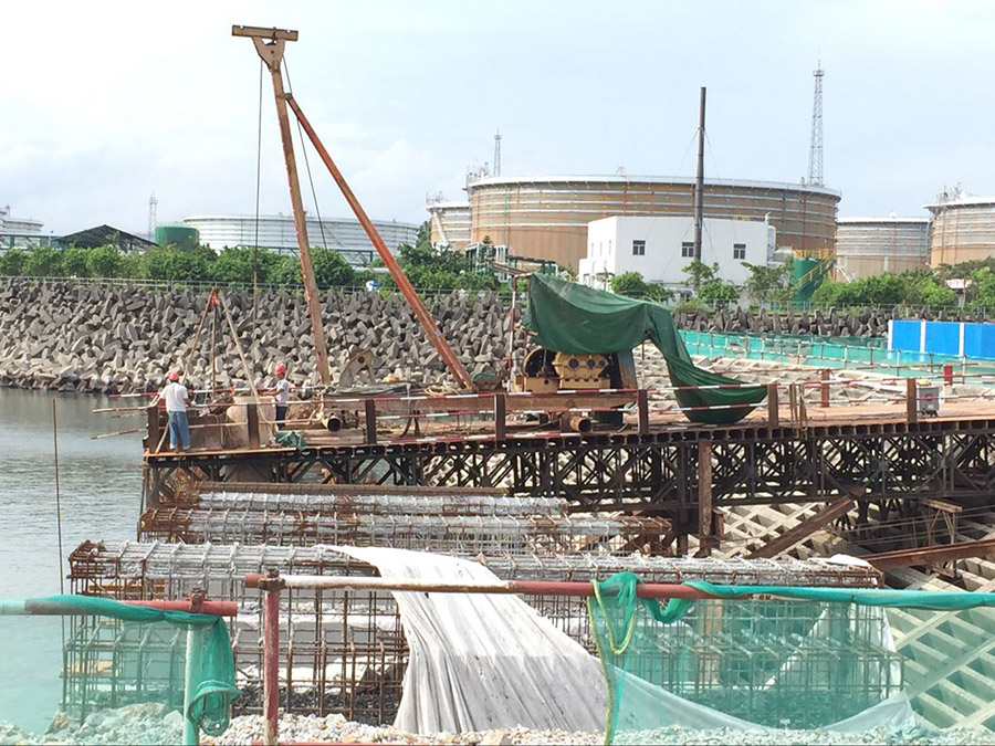 (一)燃料油調(diào)和配送中心項目 擬建庫容為115萬立方米罐區(qū)。其中: 1.重油罐組60萬立方米:6座10萬立方米(80m×21.8m)儲罐。 2.燃料油罐組(調(diào)和罐)40萬立方米:8座5萬立方米(60m×19.3m)儲罐。 3.重柴油罐組15萬立方米:5座3萬立方米(44m×21.78m)儲罐,1座3萬立方米拱頂儲罐。 庫區(qū)油品年周轉(zhuǎn)量為1200萬噸,重油、重柴油、燃料油年周轉(zhuǎn)次數(shù)分別為17次、16次、30次。 (二)配套碼頭工程項目 配套碼頭設計總吞吐能力為2405萬噸/年。建設一個30萬噸級油接卸船碼頭(30萬噸級泊位長度470m),和三個2萬噸級燃料油出運碼頭(三個2萬噸級泊位總長665m,寬20m)以及相應配套設施。 (三)35KV升壓變電站及海底電纜 本項目建設35KV升壓變電站(1×12.5MVA)一座及敷設海底電纜總長約16km(含6km陸域電纜),為燃料油調(diào)合配送中心及碼頭生產(chǎn)提供電力。